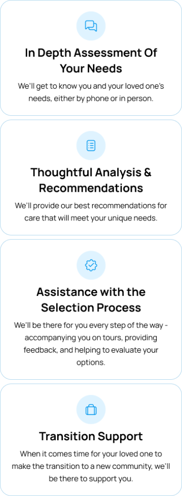 Moving into an assisted living setting can feel like a big life transition, but it doesn’t have to be a distressing one. There are always worries about happiness and well-being, but with a fitting environment, this transition can bring new joy, routines, and friendships. Our care advisors take into account personality and lifestyle to suggest settings where your loved one will feel truly valued and comfortable.
